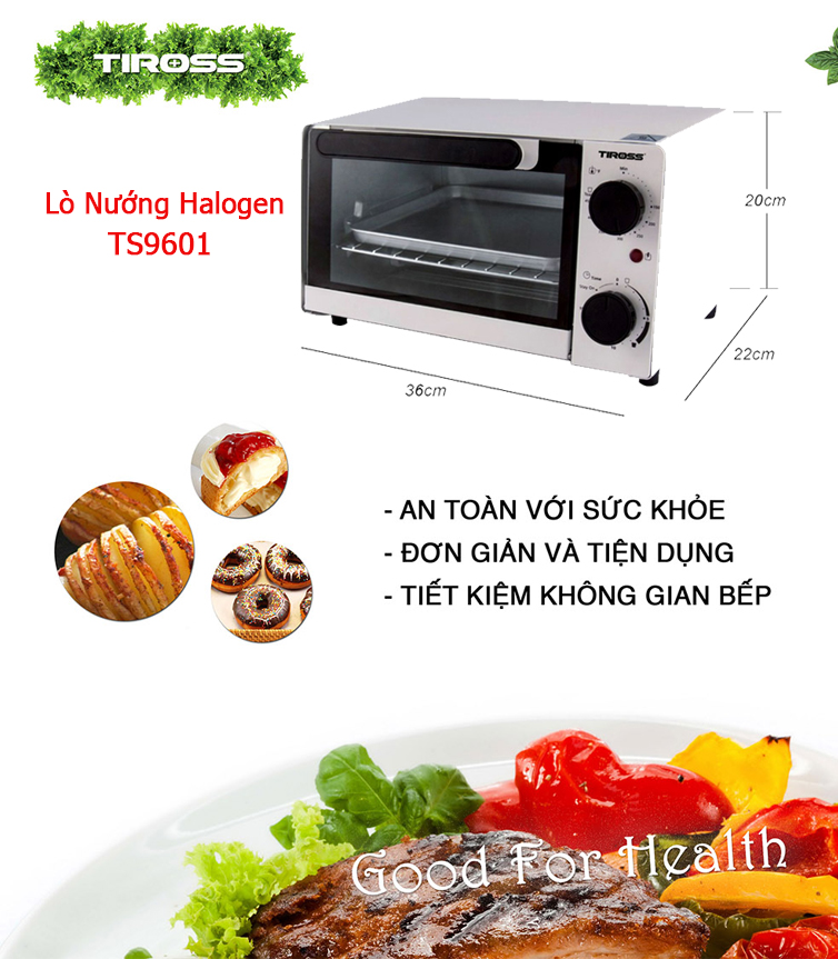 Tiross TS9601 sử dụng 2 bóng Halogen công suất 1200W, hỗ trợ tùy chỉnh nhiệt độ 900C – 2300C để bạn có thể chế biến nhiều món ăn khác nhau. Chế độ hẹn giờ 15 phút giúp bạn rảnh tay làm nhiều công việc nội trợ khác, tiết kiệm thời gian và công sức đáng kể.