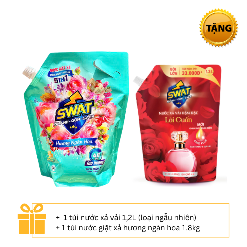 REC_ Swat_5 túi nước giặt dưỡng vải chống nhăn 3,5kg + 1 túi nước xả vải 1,2l + 1 túi Nước giặt xả SWAT hương ngàn hoa 1.8kg
