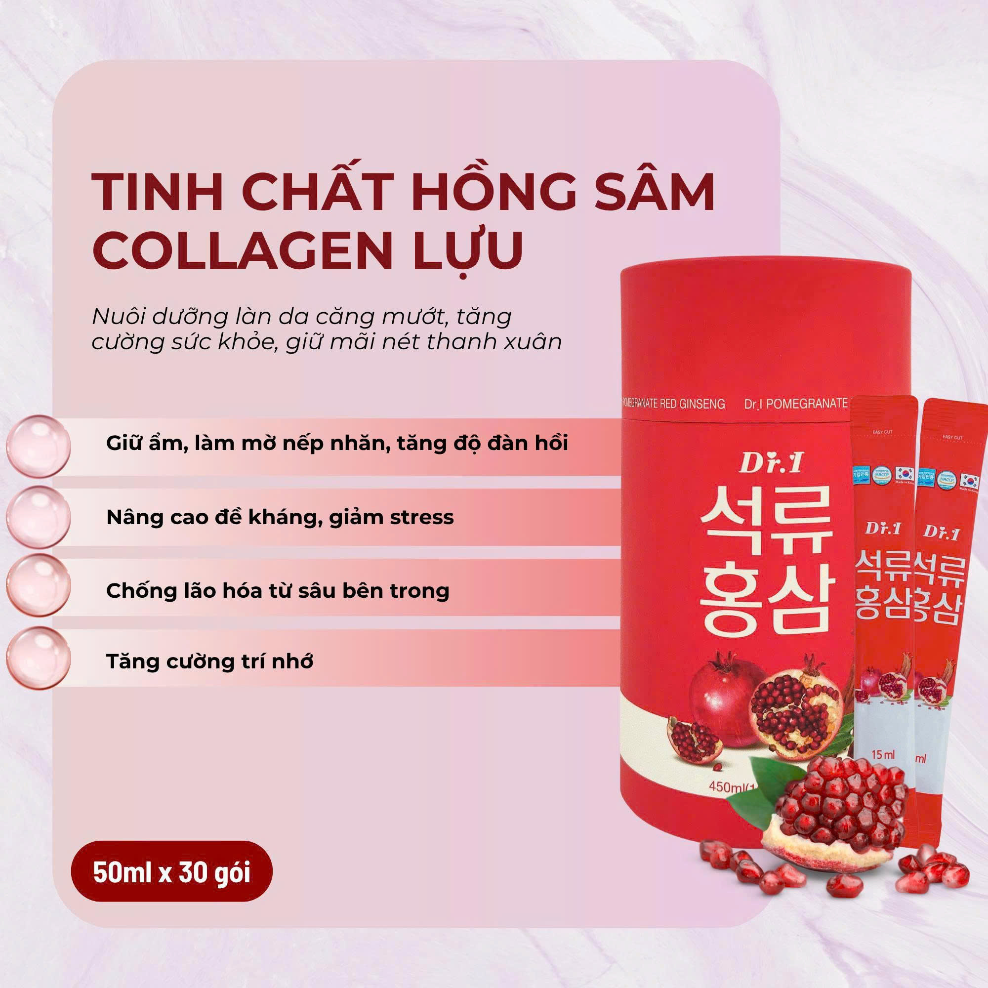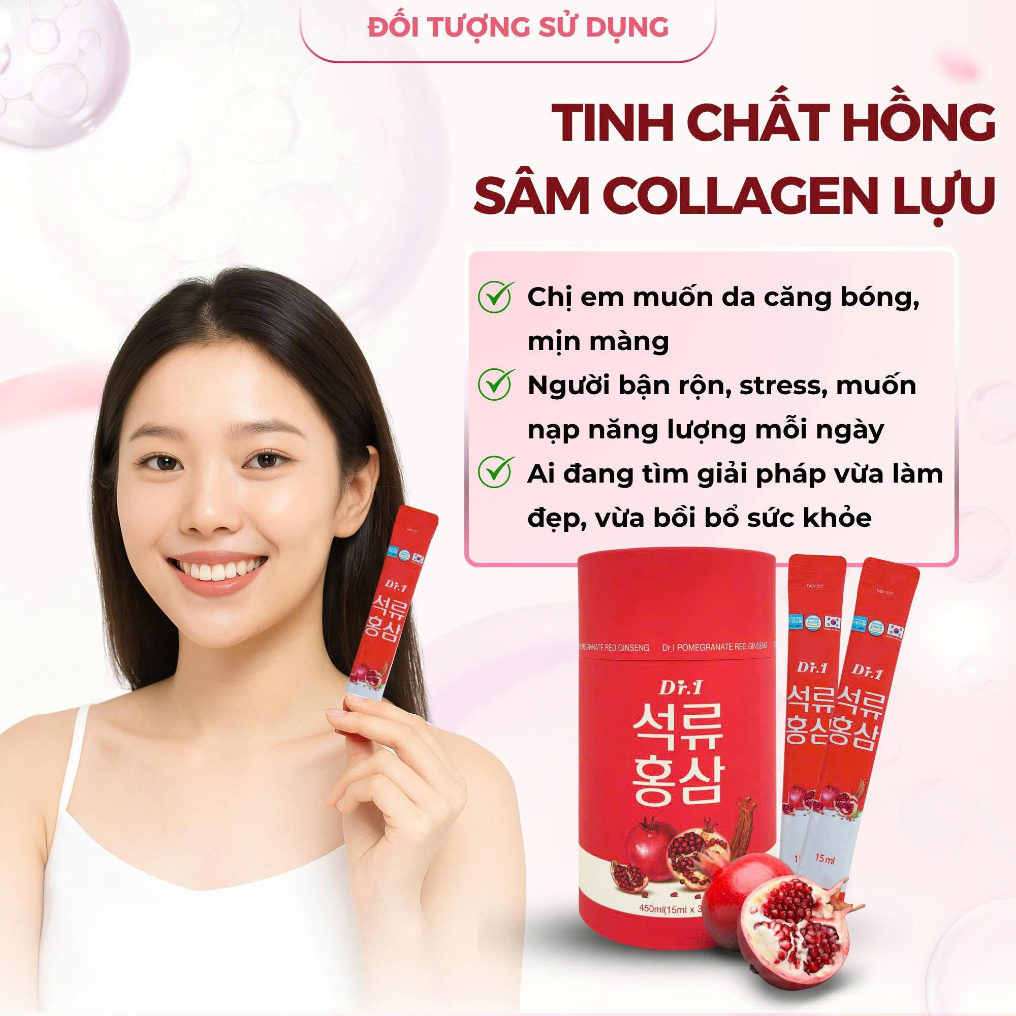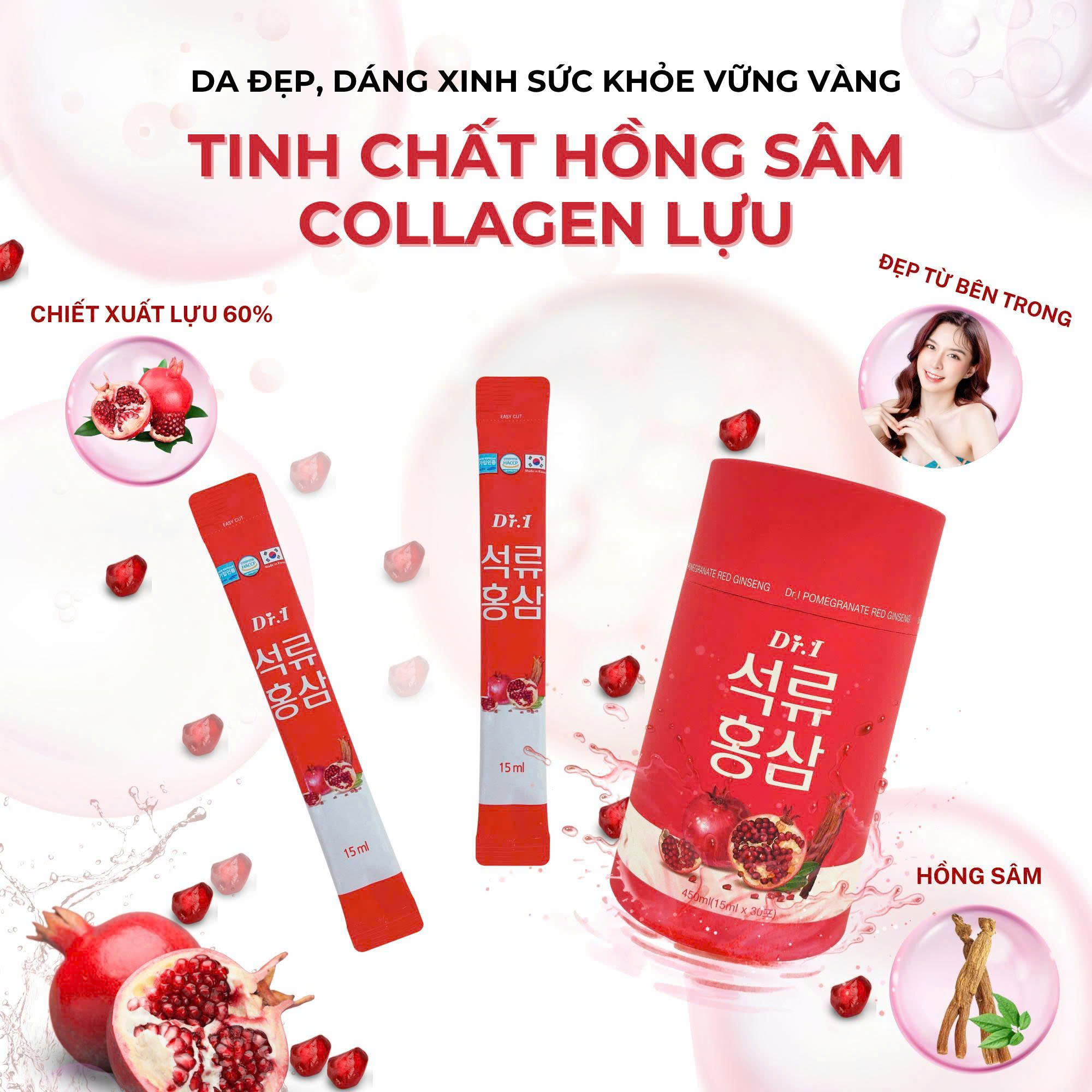 - Thành phần: Xi-rô ngô, nước tinh khiết, sản phẩm rau củ quả chế biến (nước ép lựu, lựu 100%, chiết xuất 60%) 25%, mật ong, collagen cá, chiết xuất hồng sâm (Hàn Quốc, chiết xuất 60%) 0,2%, chất ổn định (gôm xanthan).