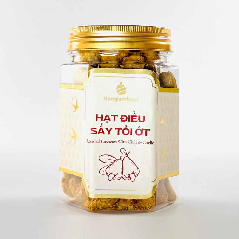 Thành phần: Hạt điều (90%), dầu thực vật, bột nếp, đường, muối, tỏi (1,5%), ớt (1%)