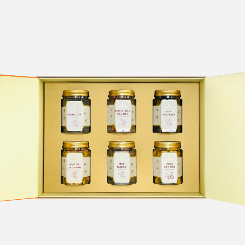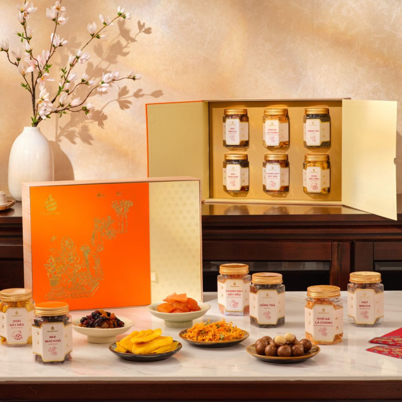 Câu chuyện đầu xuân bắt đầu bên ấm Hồng Trà Shan Tuyết Cổ Thụ ấm nồng. Hương trà tinh tế từ núi rừng cổ thụ lan tỏa, mang đến một không gian tĩnh tại, là chất xúc tác tuyệt vời để ông bà, cha mẹ và con cháu chia sẻ những tâm tình sâu lắng của một năm qua. Không khí xuân thêm phần ngọt ngào với những sản vật tinh tuyển. Đó là vị ngọt ngào, thơm lừng của Xoài Sấy Dẻo, chút chua thanh đánh thức vị giác của Chanh Dây Sấy Dẻo và vị ngọt êm đa sắc của Nho Khô Chile 3 Màu, tựa như những cung bậc cảm xúc hân hoan, hạnh phúc của ngày đoàn viên. Bữa tiệc đầu năm càng thêm trọn vẹn với vị béo bùi, giòn tan của Macca Nứt Vỏ Rang Mộc và chút mặn mà, cay thơm lưu luyến của Khô Gà Lá Chanh, tất cả tạo nên một bản hòa tấu hương vị đủ đầy, sung túc.